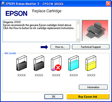 Dacă nivelul cernelii este scăzut sau cerneala este consumată, este afişat butonul How to (Cum procedez) în fereastra programului EPSON Status Monitor 3. Efectuaţi clic pe How to (Cum procedez) pentru afiarea instrucţiunilor de înlocuire a cartuşului şi deplasarea capului de tipărire în poziţia pentru înlocuirea cartuşului.