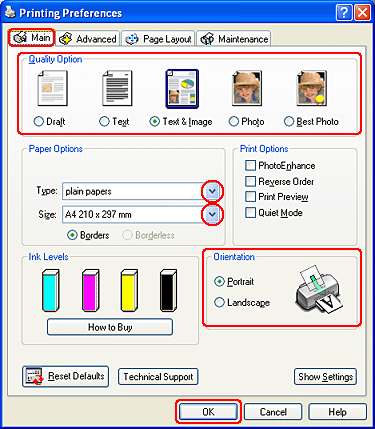 Selectaţi valoarea adecvată pentru parametrii Paper Size (Format hârtie) şi Orientation (Orientare). De asemenea, puteţi defini şi dimensiuni personalizate ale hârtiei. Pentru detalii, consultaţi sistemul de ajutor online.