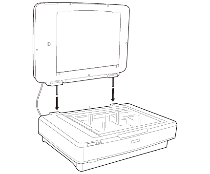 Aliniaţi ştifturile unităţii cu orificiile scannerului şi apoi coborâţi unitatea până când aceasta este aşezată în siguranţă pe scanner, cu ştifturile introduse în orificii.