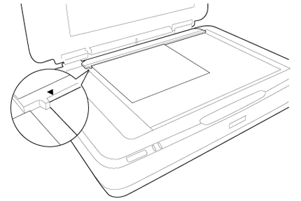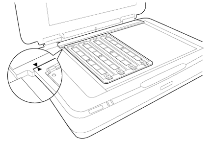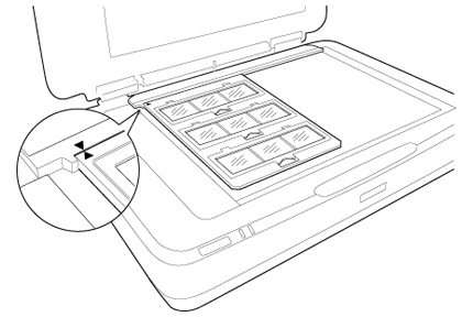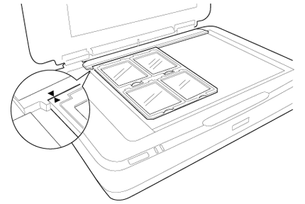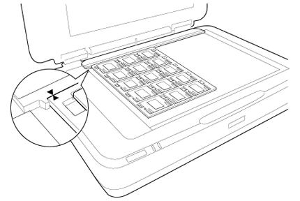 Aşezaţi suportul de film pe masa pentru documente şi aliniaţi-l cu marcajul de pe ghidul unităţii de transparenţă, aşa cum se arată mai jos.