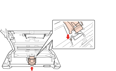 Împingeţi agrafa pe ambele părţi ale capacului rolei de alimentare, apoi deschideţi capacul.