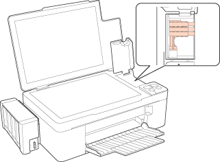 Deschideţi capacul pentru documente şi apoi deschideţi capacul saniei. Fixaţi componenta cu bandă, aşa cum este prezentat în figura de mai jos.