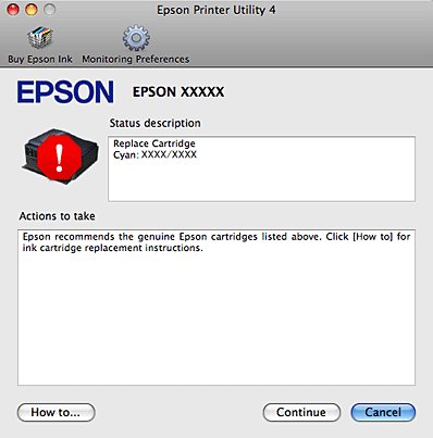 ![]() Când cerneala este insuficientă sau consumată complet, este afişat un buton How to (Cum). Faceţi clic pe butonul How to (Cum) şi programul EPSON Status Monitor vă va ghida pas cu pas în procedura de înlocuire a cartuşului de cerneală.