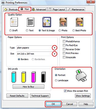Faceţi clic pe fila Main (Principal) şi selectaţi una din următoarele setări Quality Option (Opţiuni calitate):