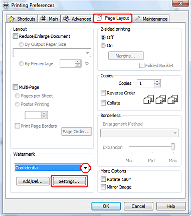 Faceţi clic pe fila Page Layout (Aspect pagină), selectaţi filigranul dorit din lista Watermark (Inscripţionare), apoi faceţi clic pe butonul Settings (Parametrii).