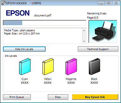 Indicatorul de progres este afişat automat la iniţierea unei sarcini de tipărire. Puteţi verifica de asemenea starea cartuşului de cerneală prin intermediul acestei ferestre. Faceţi clic pe butonul Check Ink Levels (Verifică nivelele de cerneală) de pe indicatorul de progres pentru afişarea stării cartuşului de cerneală conform indicaţiei de mai jos.