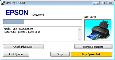 Dacă apare o problemă în timpul tipăririi, este afişat un mesaj de eroare în caseta de text a ferestrei indicatorului de progres. Pentru informaţii detaliate, faceţi clic pe Technical Support (Asistenţă tehnică) pentru accesarea Ghidului de utilizare online.