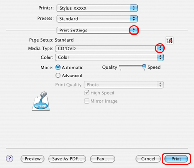 Tipărirea pe un disc CD/DVD pentru Mac OS X