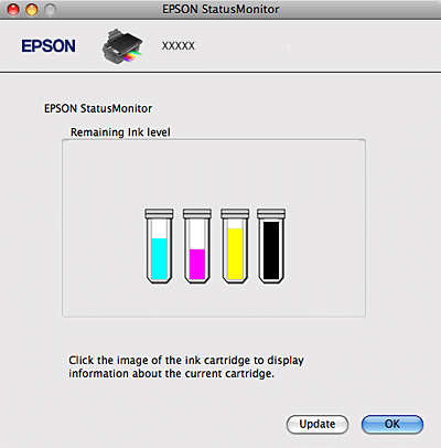 În grafic este prezentată starea cartuşelor de cerneală la prima deschidere a programului EPSON StatusMonitor. Pentru actualizarea stării cartuşului, faceţi clic pe Update.