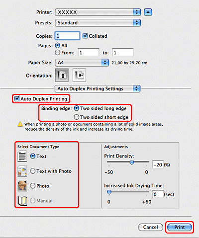 Выберите одно из перечисленных значений для параметра Select Document Type (Выбор типа документа). Таким образом автоматически изменятся параметры Print Density (Плотность печати) и Increased Ink Drying Time (Увеличенное время высыхания чернил).
