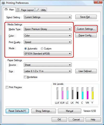 ** Не поддерживаются настройки пользовательских размеров бумаги для параметров Sheet Feeder - Borderless, Manual-Front и при печати на CD/DVD.