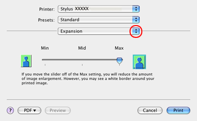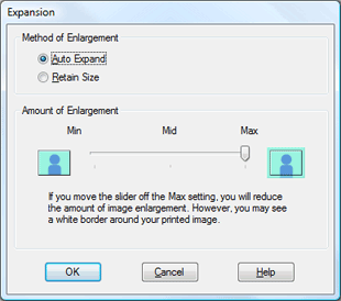 Если необходимо выполнить печать без полей, выберите Borderless (Без полей) и затем щелкните Expansion (Увеличение), чтобы открыть окно Expansion (Увеличение).