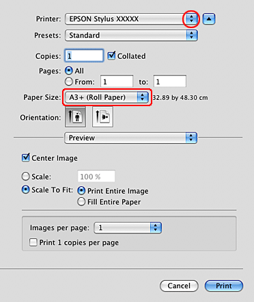 Выберите подходящий размер рулонной бумаги (the Paper Size (Размер бумаги)).