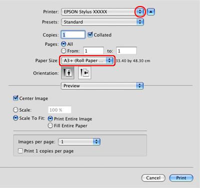 Выберите размер документа, созданного в приложении, из списка Page Size (Размер страницы) и выберите значение параметра Roll Width (Ширина рулона) либо Output Paper (Бумага на выходе).