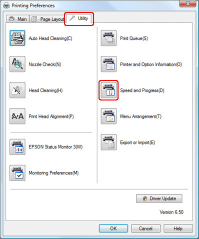Пользователи Windows могут настраивать параметры, относящиеся к скорости печати, в диалоговом окне Speed & Progress (Скорость и ход печати). Щелкните кнопку Speed & Progress (Скорость и ход печати) в окне Utility (Сервис).