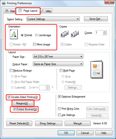 Щелкните вкладку Page Layout (Макет), выберите ориентацию отпечатка (Portrait (Книжная) или Landscape (Альбомная)) и затем установите флажок Double-Sided Printing (Двусторонняя печать).