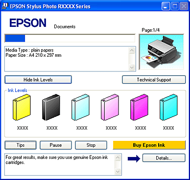 Когда вы отправляете задание на печать, на экране компьютера автоматически появляется индикатор хода выполнения. В этом диалоговом окне можно проверить уровень чернил в картриджах. Щелкните Check Ink Levels, чтобы отобразить уровень чернил в картриджах как показано на рисунке.