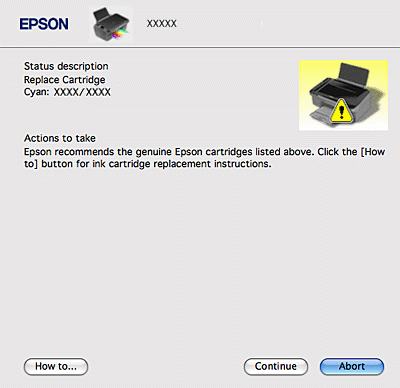 Когда чернила заканчиваются или полностью израсходованы, появляется кнопка How to (Как сделать). Щелкните кнопку How to (Как сделать) и выполните пошаговые инструкции EPSON Status Monitor 3 по замене картриджа.