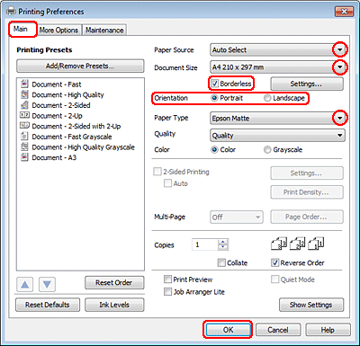 Выберите подходящее значение параметра Document Size (Размер документа). Вы также можете задать пользовательский размер бумаги. Подробности см. в интерактивной справке.