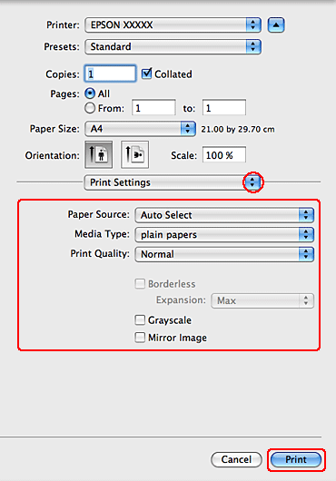 Выберите желаемые параметры. Подробности о параметре Print Settings (Параметры печати) см. в интерактивной справке.