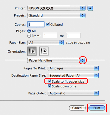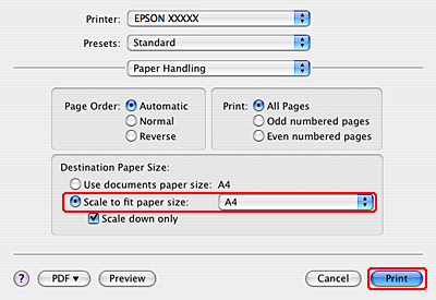 Выберите Scale to fit paper size (Под размер бумаги) как Destination Paper Size (Назначенный размер бумаги).