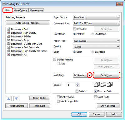 Щелкните Settings (Настройки), чтобы настроить печать плаката. Откроется диалоговое окно Poster Settings (Параметры плаката).