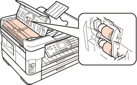Поднимите рычаг и откройте крышку автоподатчика и очистите его внутренную поверхность и ролик мягкой, сухой, чистой тканью.