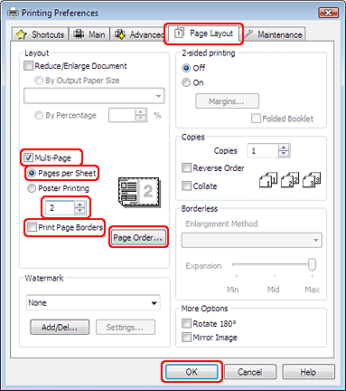 Kliknite na kartu Page Layout (Rozloženie strany), začiarknite políčko Multi-Page (Viacstránkové) a vyberte možnosť Pages per Sheet (Strany na jeden list).