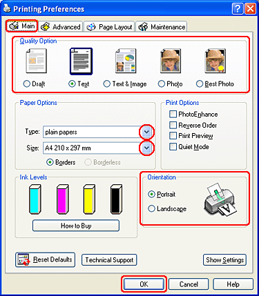 Vyberte vhodné nastavenie možností Paper Size (Veľkosť papiera) a Orientation (Orientácia). Môžete zadať aj vlastnú veľkosť papiera. Podrobnosti nájdete v on-line pomocníkovi.