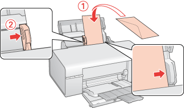 Vložte obálky krátkym okrajom s uzáverom obálky smerom nadol a doľava a vložte ich na miesto za zarážky. Potom posuňte postrannú vodiacu lištu oproti ľavému okraju obálok, ale nie príliš tesne.