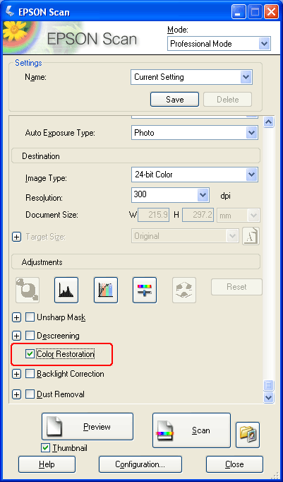 Ak chcete obnoviť farby pomocou programu Epson Scan, postupujte podľa nasledovných krokov.