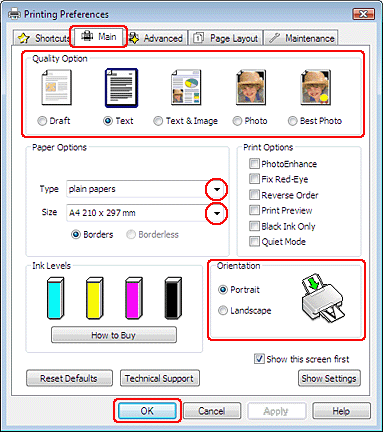 Vyberte príslušné nastavenie možností Paper Size (Veľkosť papiera) a Orientation (Orientácia). Môžete zadať aj vlastnú veľkosť papiera. Podrobnosti nájdete v on-line pomocníkovi.