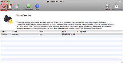 Ak tlač nemožno obnoviť, kliknite na ikonu tlačiarne v doku. Ak sa zobrazí chybová správa s pokynom na zrušenie tlačovej úlohy, kliknite na tlačidlo Delete (Odstrániť) a podľa nižšie uvedených krokov vytlačte dokument čiernym atramentom.