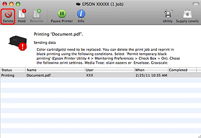 Ak tlač nemožno obnoviť, kliknite na ikonu tlačiarne v doku. Ak sa zobrazí chybová správa s pokynom na zrušenie tlačovej úlohy, kliknite na tlačidlo Delete (Odstrániť) a podľa nižšie uvedených krokov vytlačte dokument čiernym atramentom.