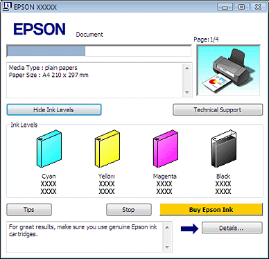 Merilnik napredovanja se samodejno pojavi ob zagonu tiskalnega opravila. V tem oknu lahko preverite stanje kartuše. Kliknite gumb Check Ink Levels na zaslonu merilnika napredovanja, da prikažete stanje kartuše s črnilom, kot je prikazano spodaj.