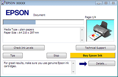 NasvetiRazlični nasveti za boljši izkoristek Epsonovega gonilnika tiskalnika se pojavijo v besedilnem polju okna z merilnikom napredovanja. Za več podrobnosti o nasvetih, prikazanih v oknu, kliknite gumb Details.