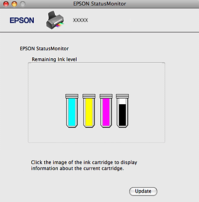 ![]() Ta pripomoček lahko uporabite tudi za preverjanje stanja kartuše s črnilom pred tiskanjem. EPSON StatusMonitor prikaže stanje kartuše s črnilom v času, ko ste jo odprli. Za posodobitev stanja kartuše s črnilom kliknite Update.