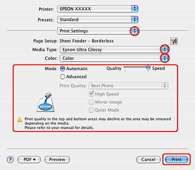 Izberite primerno nastavitev Media Type, Color in Mode. Če želite več podrobnosti o Print Settings, si oglejte elektronsko pomoč.