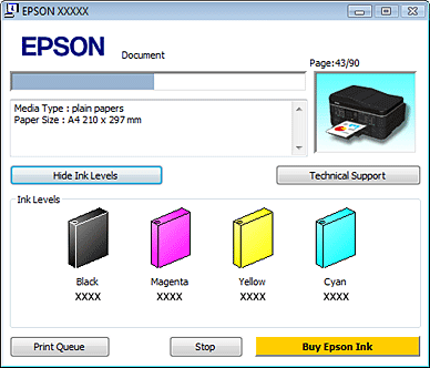 Merilnik napredovanja se samodejno pojavi ob zagonu tiskalnega opravila. V tem oknu lahko preverite stanje kartuše. Kliknite gumb Check Ink Levels na zaslonu merilnika napredovanja, da prikažete stanje kartuše s črnilom, kot je prikazano spodaj.