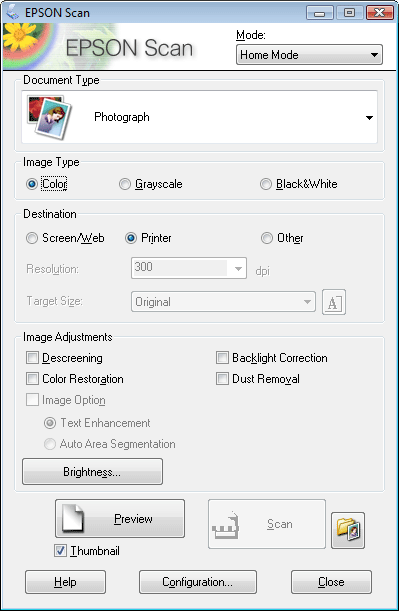 Optično branje v načinu Home ModeKo izberete Home Mode, se prikaže okno Epson Scan Home Mode.