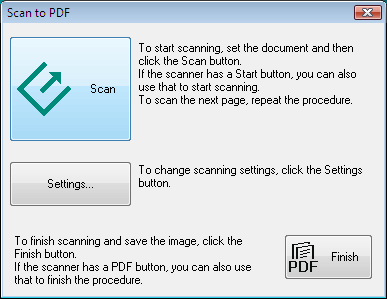 Kliknite Finish ali pritisnite  gumb PDF na optičnem bralniku. Dokument je shranjen v obliki datoteke PDF v mapo Pictures ali My Pictures oz. na mesto, ki ste ga določili v oknu File Save Settings.