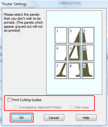 Tukaj je primer, kako narediti poster z izbirami 2x2 pod Poster Printing in Overlapping Alignment Marks kot Print Cutting Guides.