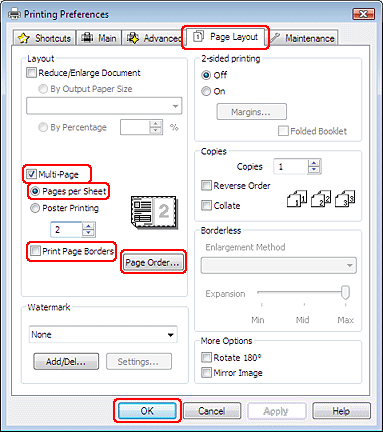 Kliknite jeziček Page Layout, izberite Multi-Page, natoPages Per Sheet.