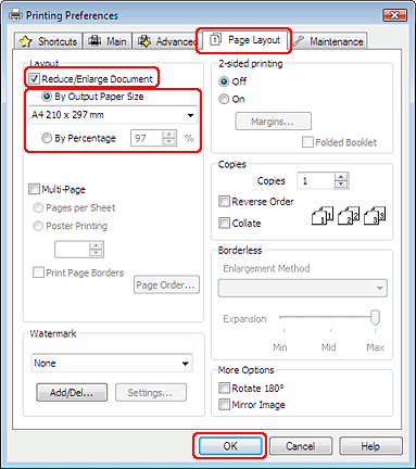 Kliknite jeziček Page Layout in potrdite potrditveno polje Reduce/Enlarge Document.