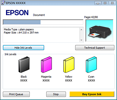 Kada započnete zadatak štampanja automatski će se pojaviti traka toka. Pomoću ovog prozora možete proveriti status kertridža sa mastilom. Kliknite na dugme Check Ink Levels na ekranu sa trakom toka da biste prikazali status kertridža sa mastilom, kao što je prikazano ispod.
