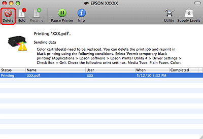 Ako štampanje ne može da se nastavi, kliknite na ikonu štampača na traci Dock (Paleta). Ako se prikaže poruka o grešci koja zahteva da se otkaže posao štampanja, kliknite na Delete i obavite donje korake da biste dokument odštampali crnim mastilom.