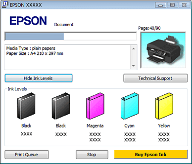 Kada započnete zadatak štampanja automatski će se pojaviti traka toka. Pomoću ovog prozora možete proveriti status kertridža sa mastilom. Kliknite na dugme Check Ink Levels na ekranu sa trakom toka da biste prikazali status kertridža sa mastilom, kao što je prikazano ispod.