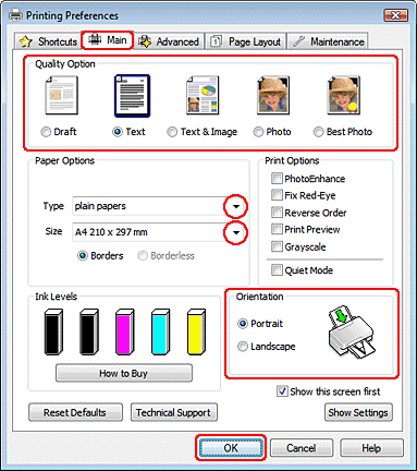 Izaberite odgovarajuće postavke za Paper Size i Orientation.