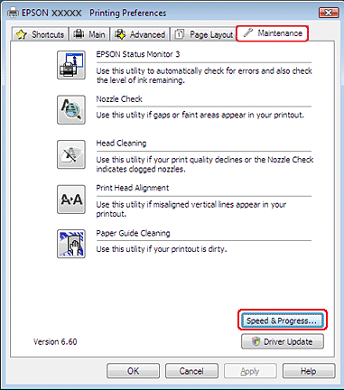 Brzinu štampanja možete povećati ako izaberete određene postavke u prozoru Speed & Progress ako je štampanje previše sporo. Kliknite na dugme Speed & Progress u prozoru Maintenance upravljačkog programa za štampač.