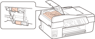 Öppna ADF-luckan och använd en mjuk, torr, ren trasa för att rengöra rullen och de inre delarna av ADF:en.